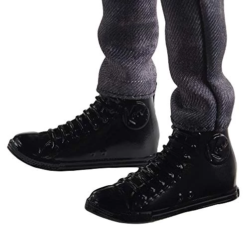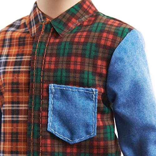 - Ken doll is more slender than the original body and wears a mixed plaid and denim shirt with black denim pants.