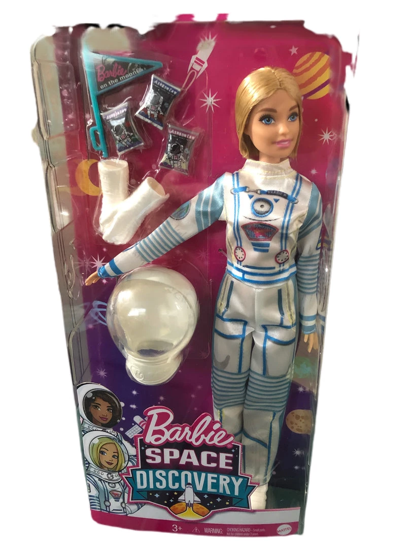 Inspire imaginations to take off to new worlds with Barbie Space Discovery dolls and toys. Barbie astronaut doll is ready to launch a new story with the equipment needed to make her journey — a shimmery spacesuit, helmet and gloves. A Barbie flag and three packs of astronaut food (non-edible) set her mission on a course for success! Kids, especially those fascinated with space and science, will love exploring the possibilities with Barbie. Dolls cannot stand alone.