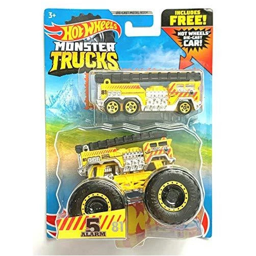Details: HotWheels Monster Trucks 5 Alarm (yellow) – 1:64 Scale with free fire truck car