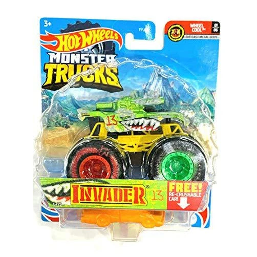 Details: HotWheels Monster Trucks 2021 Invader 6/75 with re-crushable car, Wheel Cool 01/06