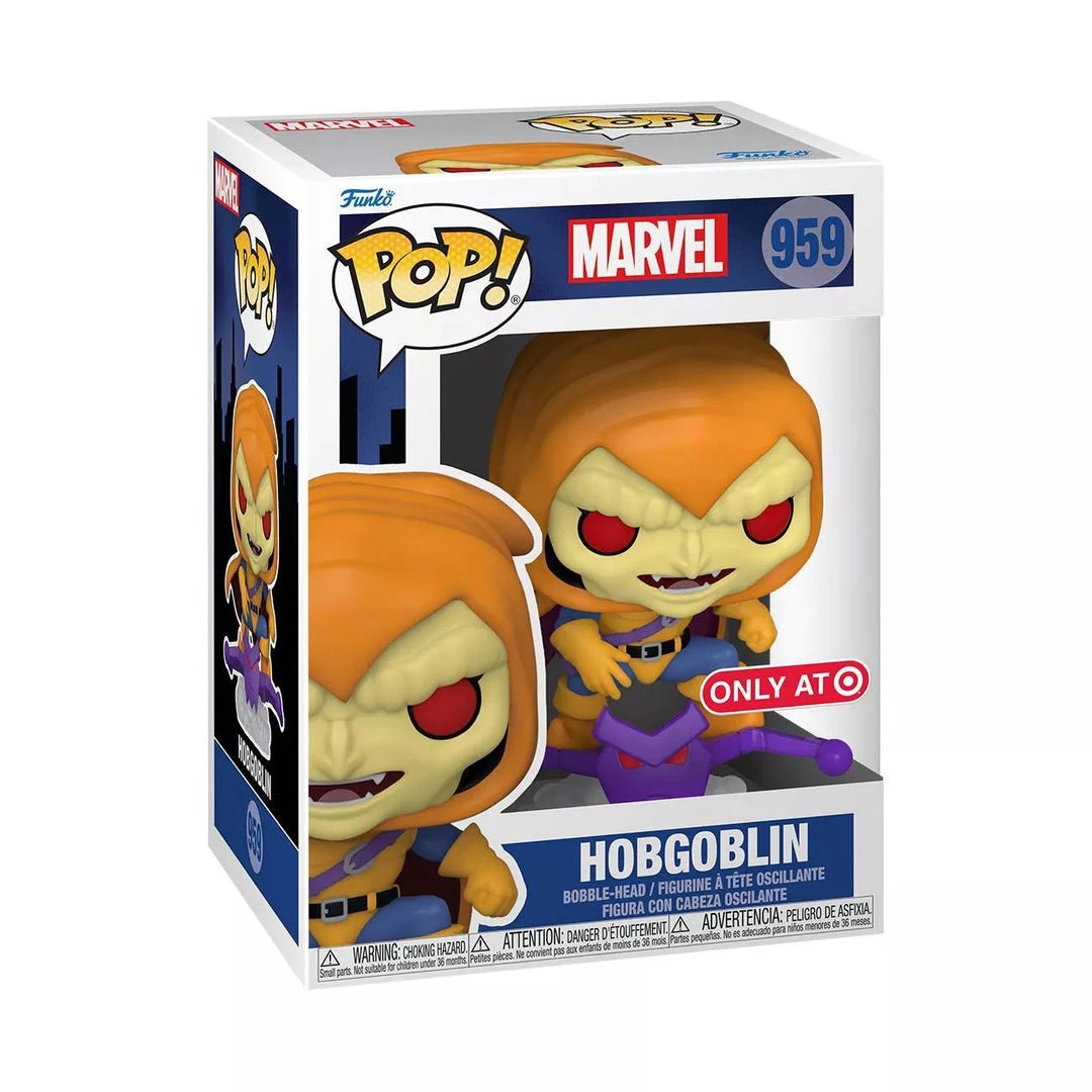 Funko POP! Marvel Hobgoblin Exclusive Vinyl Bobble-Head Figure #959. Soaring overhead on his glider, the Hobgoblin is ready to unleash pumpkin bombs. Collect the notorious villain Hobgoblin Pop! from the Spider-Man Animated Series before he can do any further damage. This bobblehead, which is approximately 4.43-inches tall, shows the Hobgoblin in full force, riding the Goblin Glider and causing destruction. Add him to your collection to keep him out of trouble.
