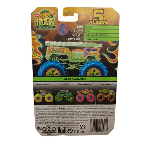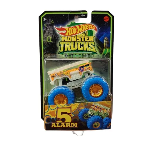 - Hot Wheels 2021 Monster Trucks 1:64 Scale Die-Cast Glow in The Dark 5-Alarm Fire Truck