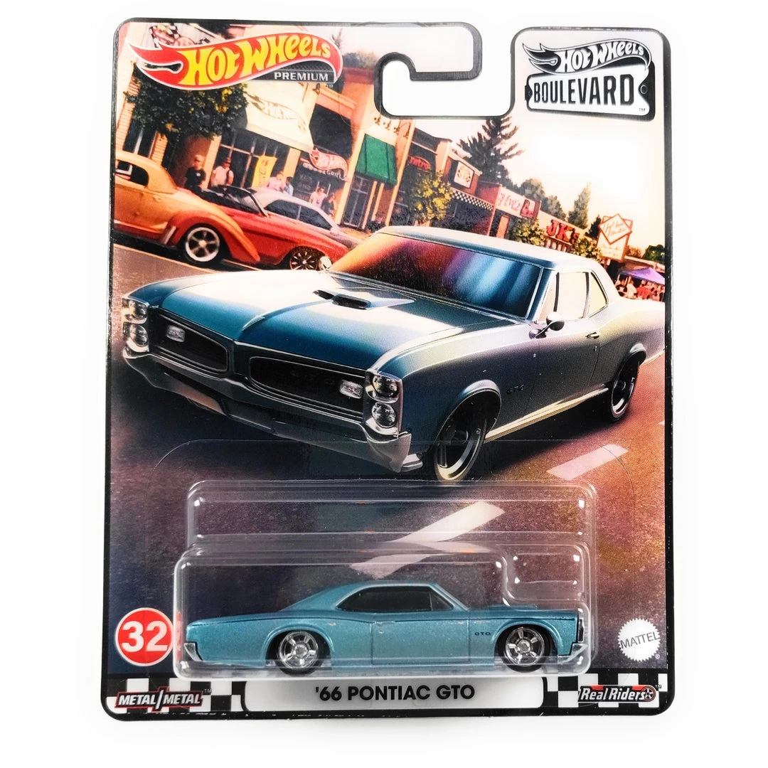 Hot Wheels Premium ’66 Pontiac GTO #32 Blue Boulevard Series 1:64 Scale Vehicle. The Hot Wheels Boulevard Series collection features a premium assortment of Hot Wheels 1:64 scale vehicles that collectors and Hot Wheels newcomers will love. Each model highlights the realistic castings, awesome decos and signature wheels of the Hot Wheels brand that kids and collectors enjoy. Car enthusiasts will find these a must-have! Each sold separately, subject to availability. Not for use with some Hot Wheels sets. Colors and decorations may vary.