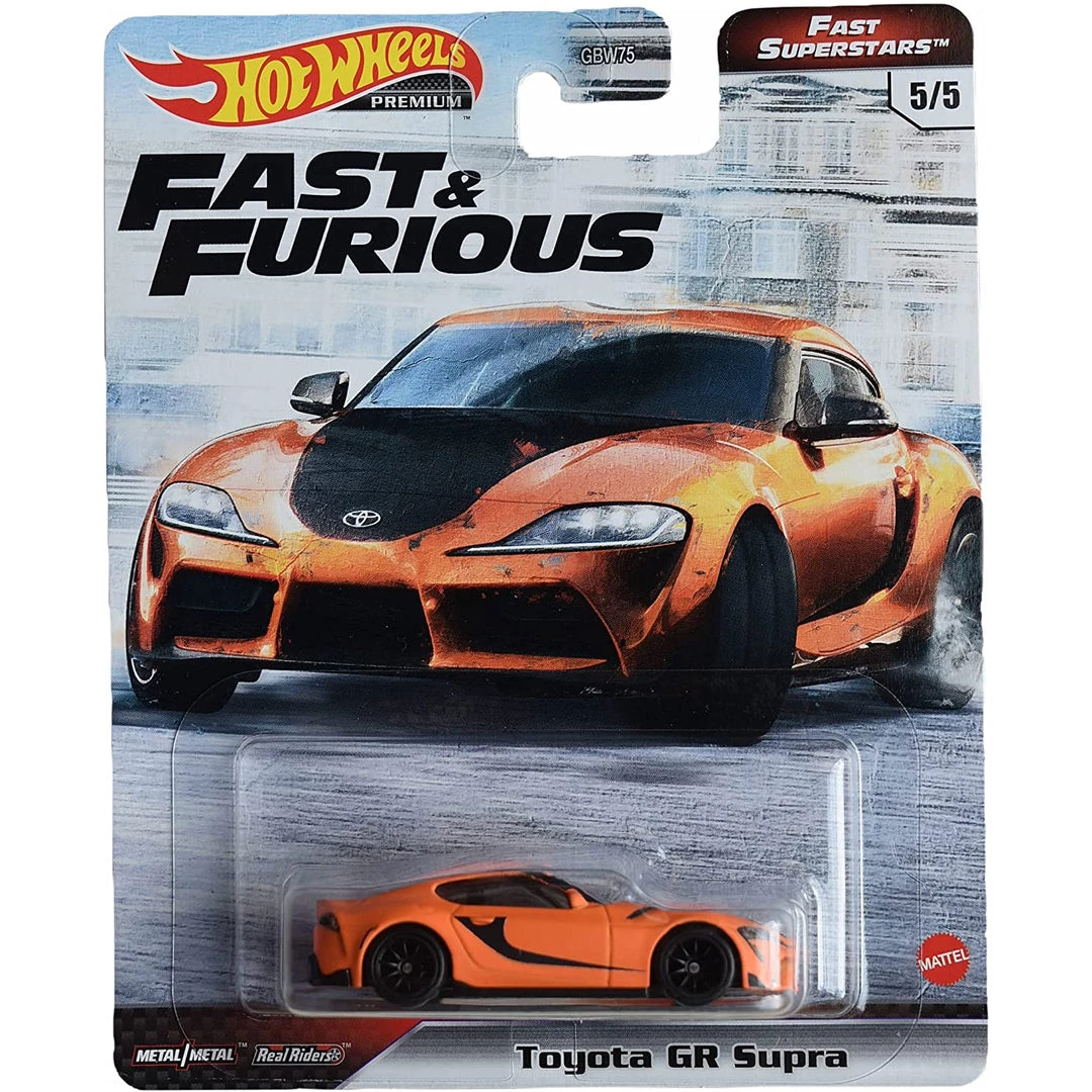 Hot Wheels Premium Fast & Furious Toyota GR Supra Fast Superstars 5/5 orange 1:64 scale vehicle. Fast & Furious is the action-Packed global film franchise built on speed, pulse-pounding stunts, and supercharged cars. The Fast & Furious 1:64 scale collection boasts exciting colors and eye-catching designs. Details and graphics are stylish and true to the Fast & Furious franchise. Perfect for collectors, car enthusiasts and Fast & Furious fans! Each sold separately, subject to availability. Colors and decorations may vary.