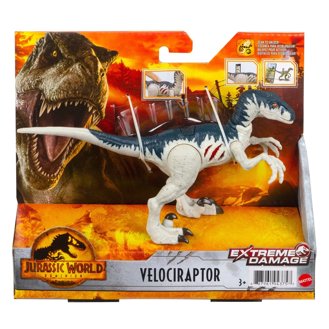 Jurassic World Dominion Extreme Damage Velociraptor Dinosaur Action Figure. Get ready for the thrills and adventure of Jurassic World: Dominion with these Extreme Damage dinosaur figures inspired by the movie. Each action figure features extreme slash damage on BOTH SIDES! Just press the button on top to reveal the double-sided damage! These carnivore figures also have movable joints, authentic sculpting and realistic color and texture. Choose from a variety of figures, including some EXCLUSIVE dinosaurs. Bring these dinosaurs TO LIFE with extended digital play using Augmented Reality! Dare to see how REAL dinosaur play can get! Just scan the hidden DNA code with any smart device to unlock the AR experiences in the free Jurassic World Facts app. Smart device not included. Colors and decorations may vary. Each sold separately, subject to availability. For ages 3 years old and up.