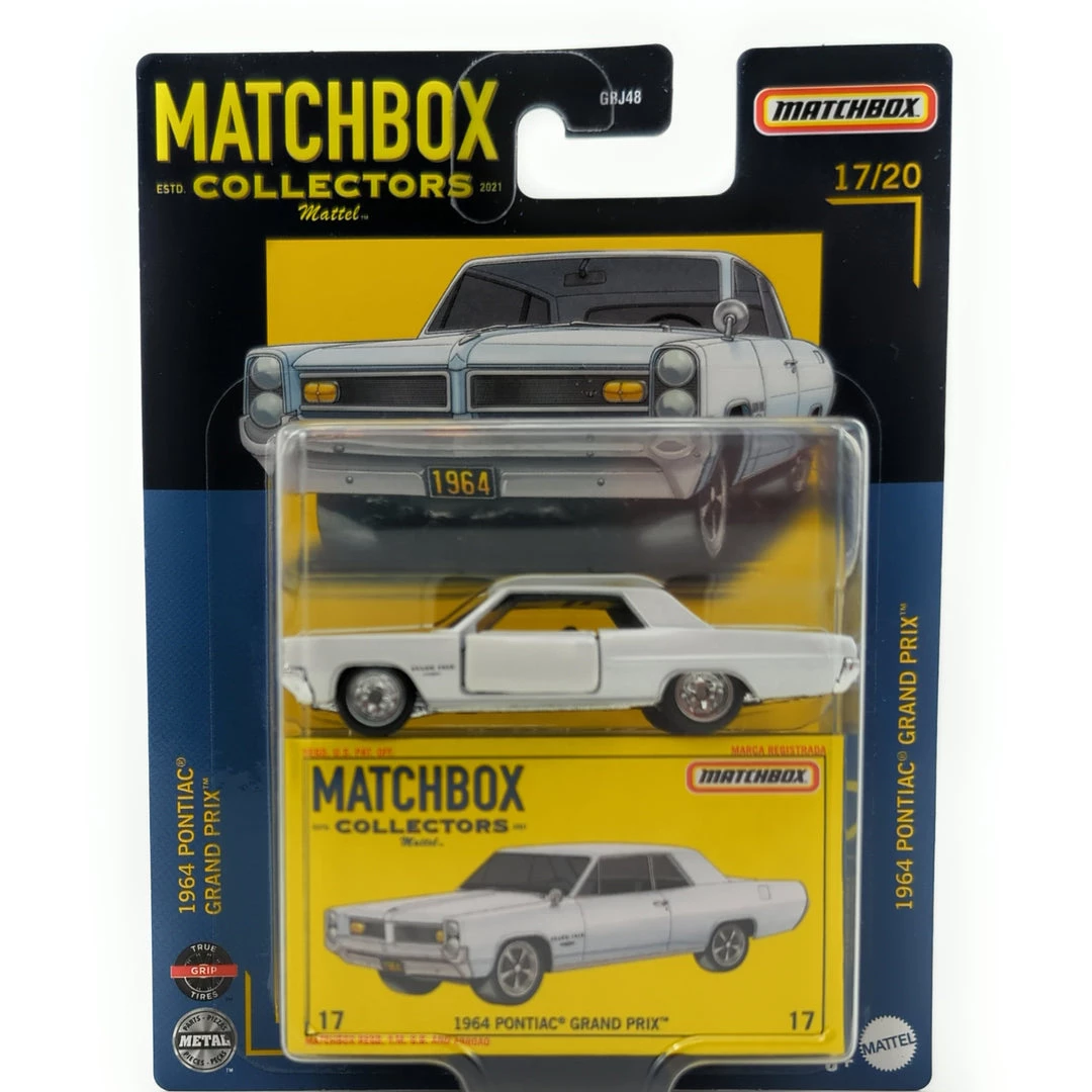 Matchbox Collectors Series 17/20 1964 Pontiac Grand Prix White 1:64 scale diecast collectible car for 3 and up. Matchbox collectible vehicles are the very best execution of the classic 1:64 scale cars. Each vehicle features remarkable true-to-life decos and special rubber-like rolling wheels. Some models have moving parts, like doors that open, making them great for display or adventure play. Car lovers ages 3 years and older can collect them all. Each sold separately, subject to availability. Not for use with some Matchbox sets. Colors and decorations may vary.