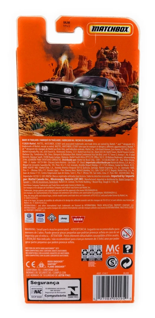Matchbox Rocky Peaks 5 Pack die-cast vehicle set includes a Sand Shredder, ’74 Volkswagen Type 181, 1968 Ford Mustang GT CS, Jeep Cherokee, and ’76 International Scout 4×4. These 1:64 scale vehicles feature detailed design elements.
