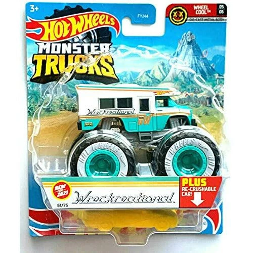 Hot Wheels Monster Trucks Die-Cast Metal Body Wreckreational Monster Truck Plus Re-Crushable Car. This Wreckreational monster truck features a white and aqua paint job and gray chassis with white wall monster truck tires. Wreckreational is a RV truck that is a campsite king on a permanent vacation. Wreckreational is in the Wheel Cool series of Hot Wheels Monster Trucks.