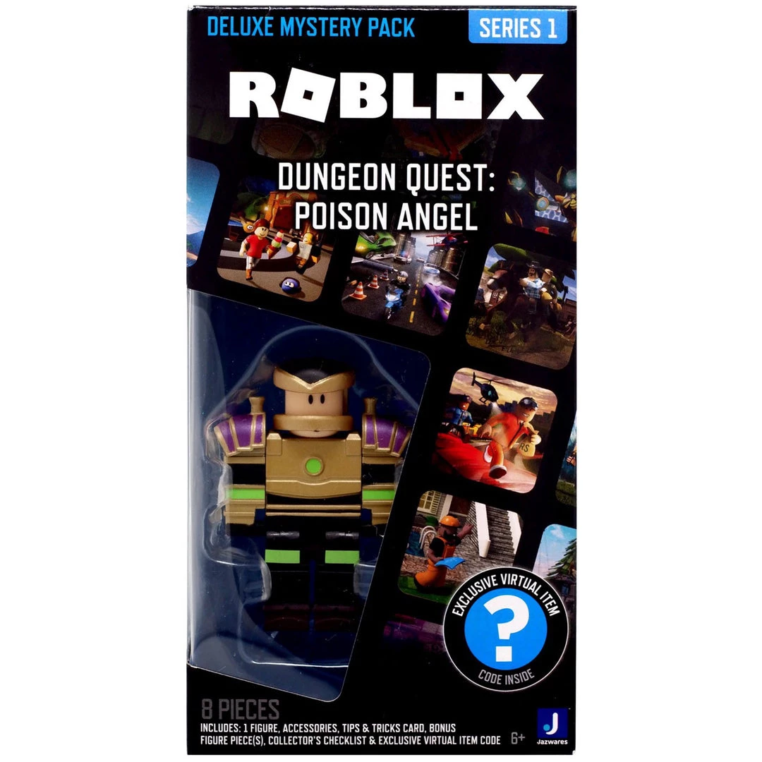 Roblox Series 1 Dungeon Quest: Poison Angel Deluxe Mystery Pack includes: 1 Figure, Accessories, Tips & Tricks Card, Bonus Figure Pieces, Collector’s Checklist & Exclusive Virtual Item Code.