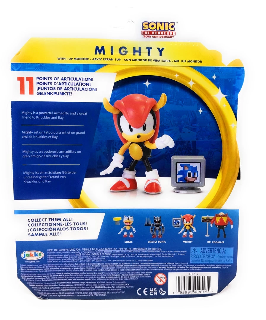 The Mighty four inch articulated figure is sure to be a hit with kids and Sonic fans! This authentic figure has articulated limbs and comes with an Invincible 1-Up Monitor accessory.