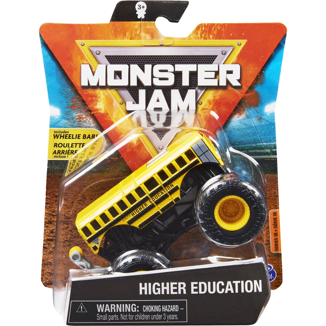 Monster-Jam Higher Education, Wheelie Bar Truck Series 18 Arena Favorites 1:64 Scale, Yellow. Introducing the all-new, official 1:64 scale die-cast Monster Jam monster truck! This lean, mean, Monster Jam machine features awesome graphics and details. With official BKT Tires, stylized chrome rims, and an authentic chassis, this monster truck embodies the style and swagger of its real-life counterpart! PLUS, this 1:64 scale truck comes complete with a driver molded into the driver’s seat and a detachable wheelie bar! Attach the bar to the front or the back of your truck and pop into wheelies or stoppies, just like you’ve seen in the live shows! This 1:64 scale die-cast Monster Jam truck is just like the real thing – only fun size! And now with more trucks to collect than ever before (each sold separately), it’s easy to keep track of your collection with the exclusive collector poster! Start building your Monster Jam collection today!