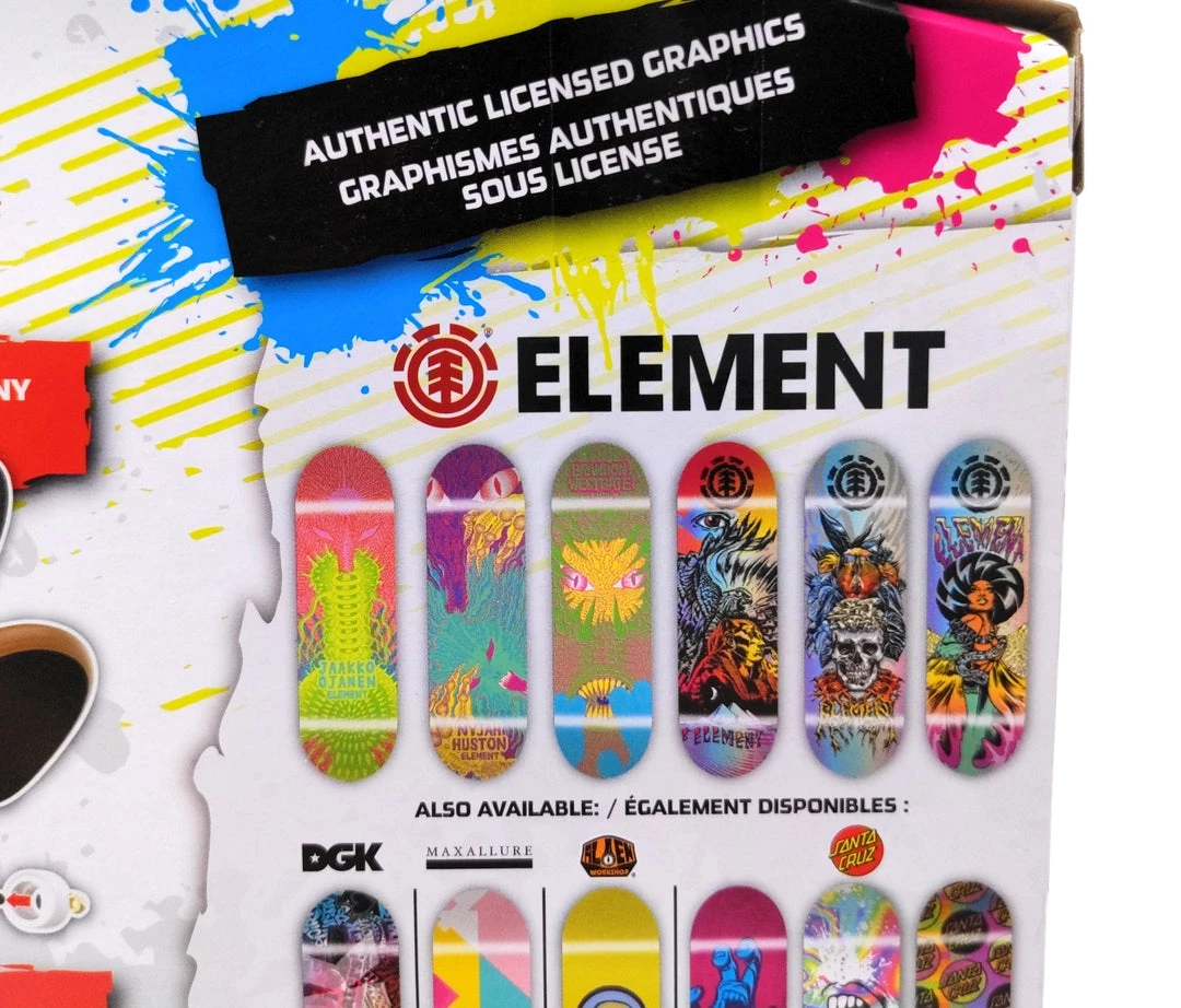 Tech Deck Neon Invasion Sk8shop Bonus Pack Element Skateboards includes 6 boards, grip tape, stickers, wheels, trucks and tools. Custom build two complete fingerboard decks. Comes with 3 Tetsunori Tawaraya collab decks including Jaakko Ojanen, Nyjah Huston and Brandon Westgate, plus 3 Ferdinand aka L’Amour Supreme decks including Queen, Pharaoh and Skull.