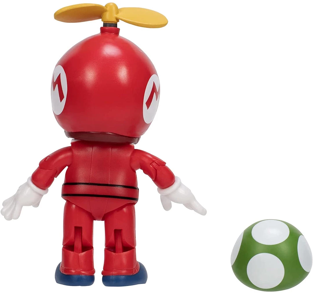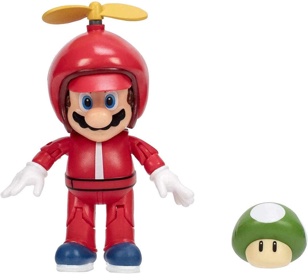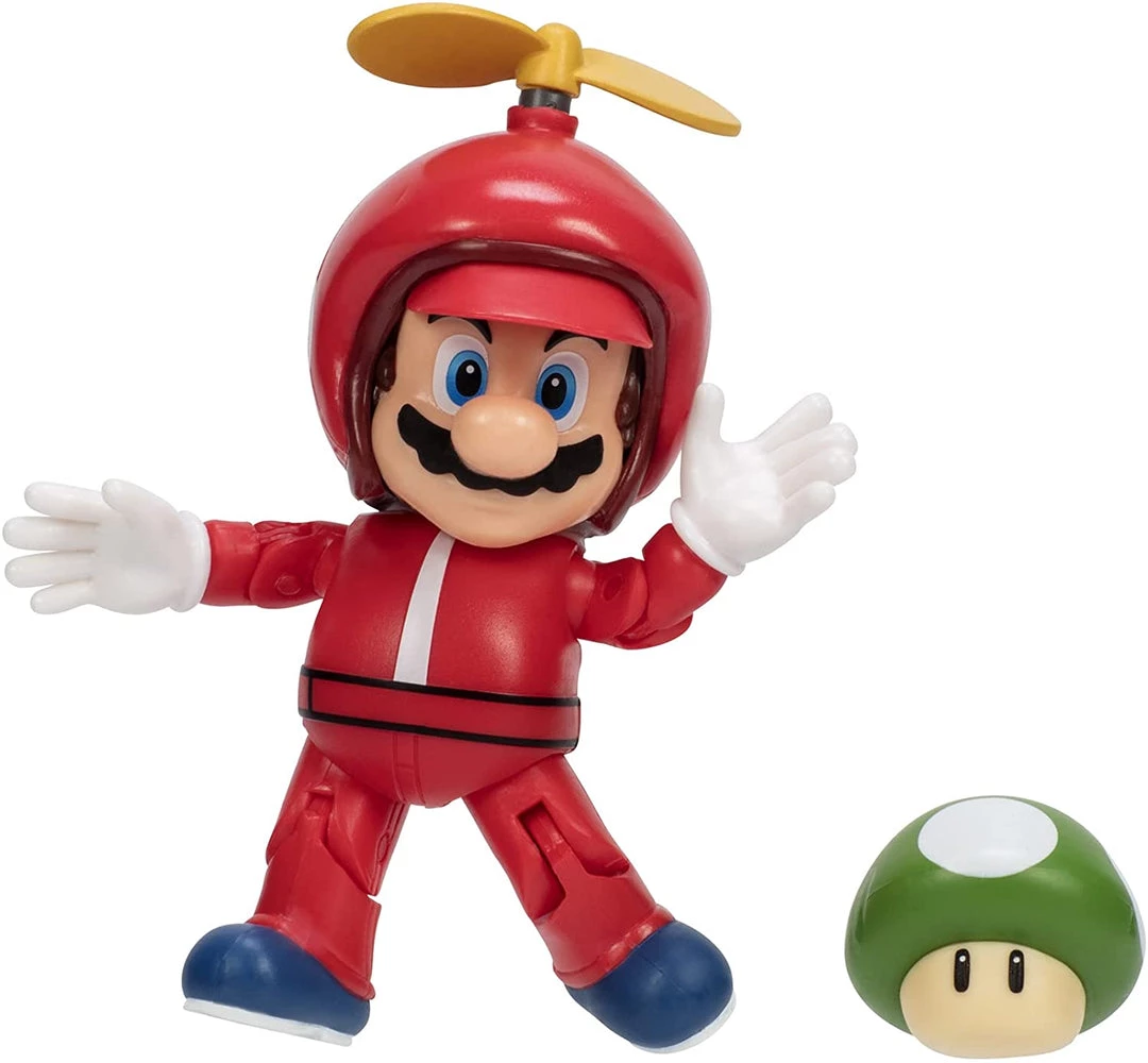 Super Mario Propeller Mario 4″ Inch Action Figure with 1-Up Mushroom Accessory. The Propeller Mario four inch figure is sure to be hit with kids and video game fans! This authentic and poseable figure has 12 points of articulation and comes with a super mushroom accessory. You can recreate the action from the games with this extraordinarily detailed figure and start your collection today.