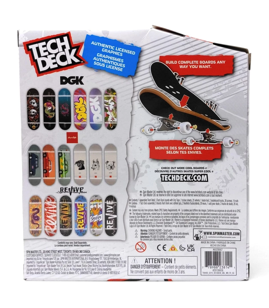 Tech Deck DGK Skateboards Sk8shop Bonus Pack 2021 Series includes 6 boards, grip tape, stickers, wheels, trucks and tools. Custom build two complete fingerboard decks. Includes Viper, Get Money 2 Boo Johnson, Chaz Ortiz Los Muertos, Blow Up, Tropic Heat, and Foil Logo decks.