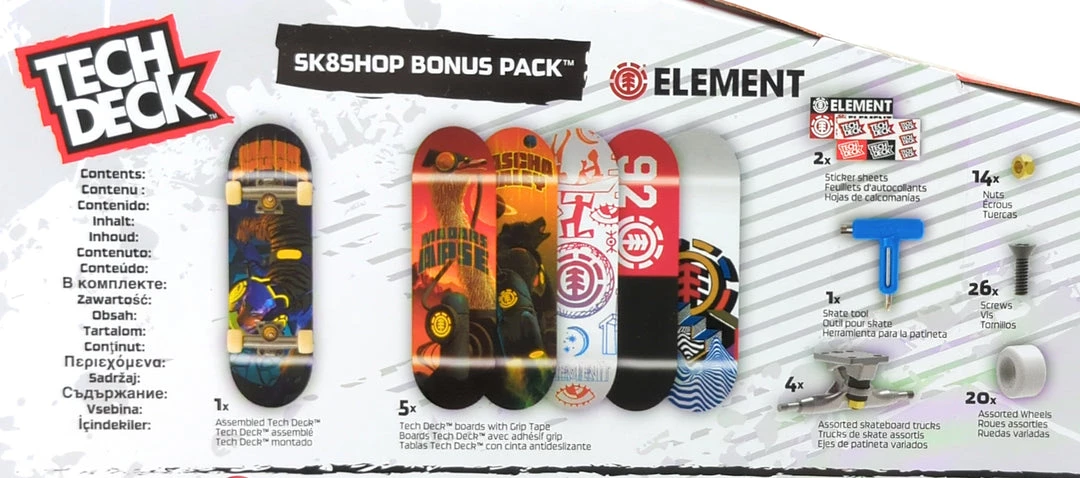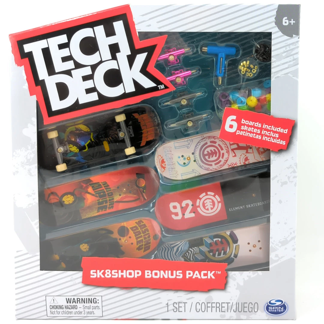 Tech Deck Element Skateboards Sk8shop Bonus Pack 2022 Series includes 6 boards, grip tape, stickers, wheels, trucks and tools. Includes 1 fully assembled deck. Custom build two complete fingerboard decks.