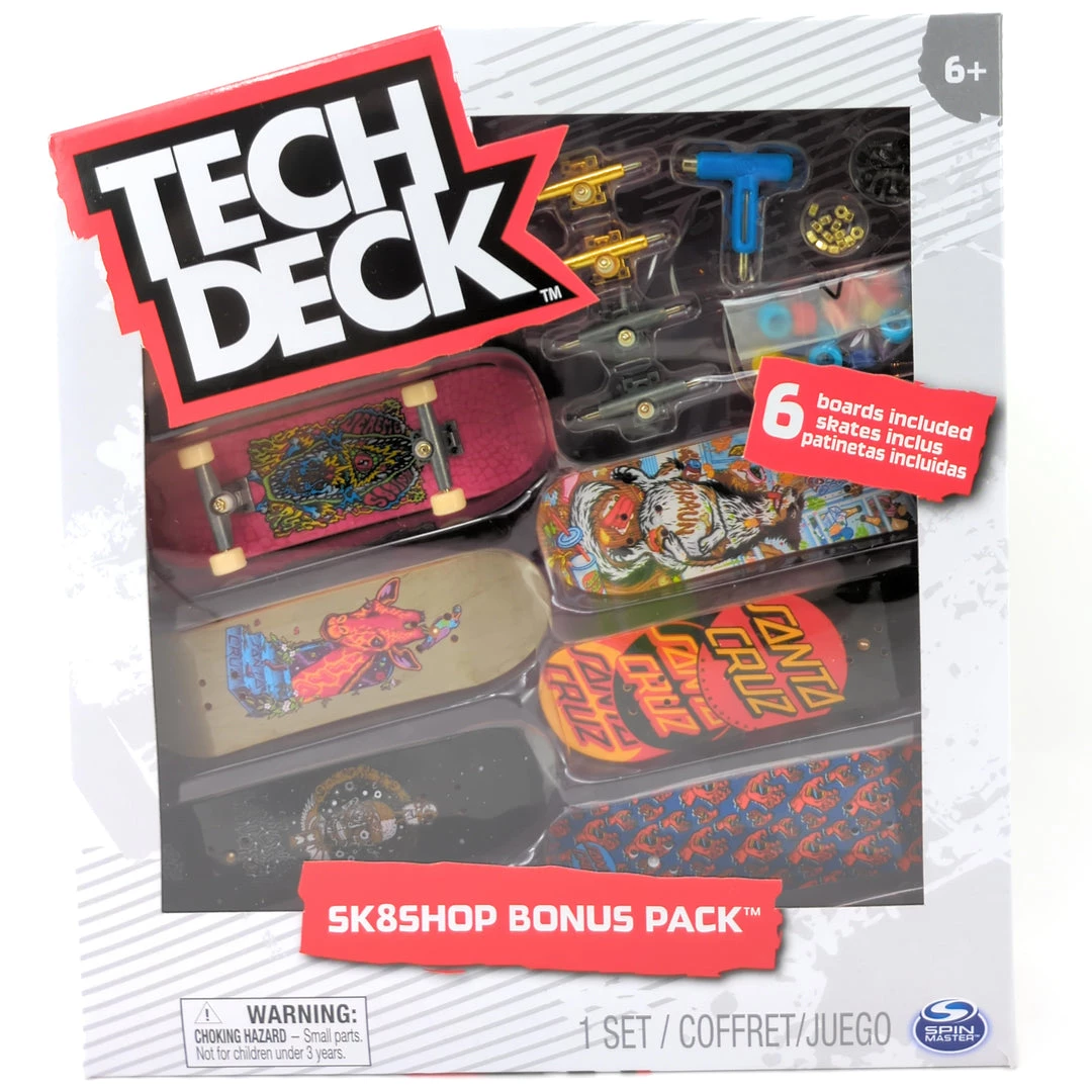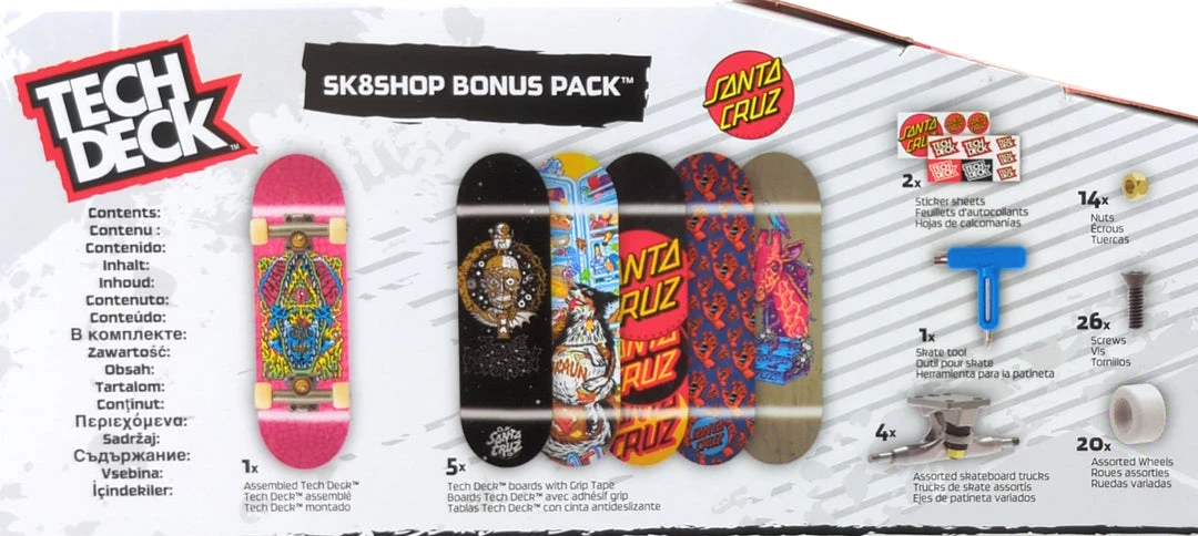 Tech Deck Santa Cruz Skateboards Sk8shop Bonus Pack 2022 Series includes 6 boards, grip tape, stickers, wheels, trucks and tools. Includes 1 fully assembled deck. Custom build two complete fingerboard decks.