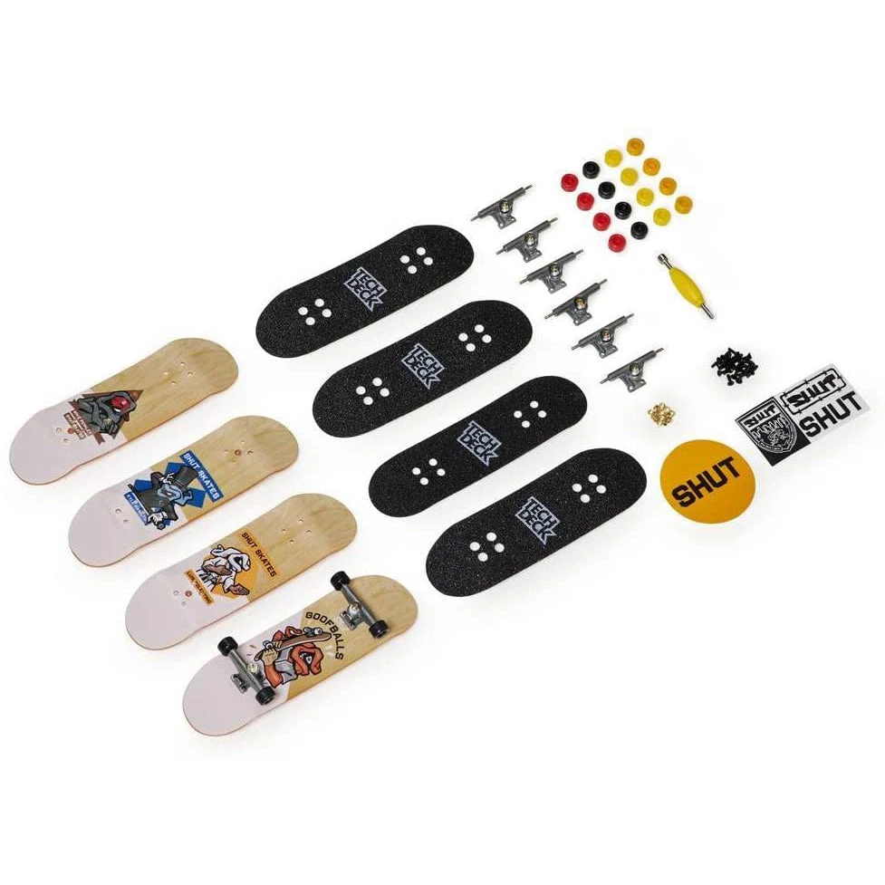 Tech Deck Shut Skates NYC Skateboards 2022 Fingerboard 4-Pack includes 1 complete Tech Deck fingerboard, plus all the parts to build 3 additional boards with Grip Tape, 2 sticker sheets, 12 wheels, 1 skate tool, 6 skateboard trucks, 24 screws and 12 nuts. Each board is approximately 96mm long.
