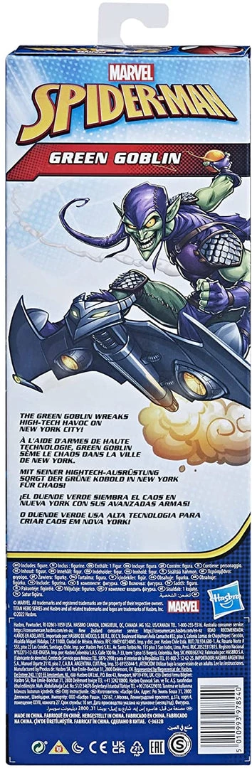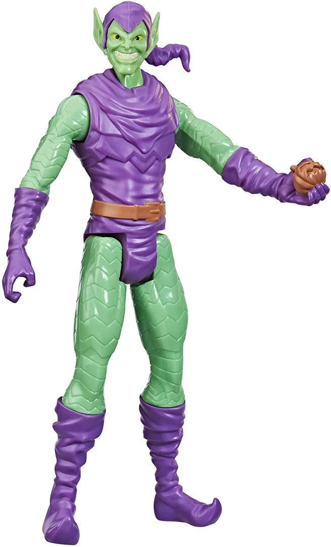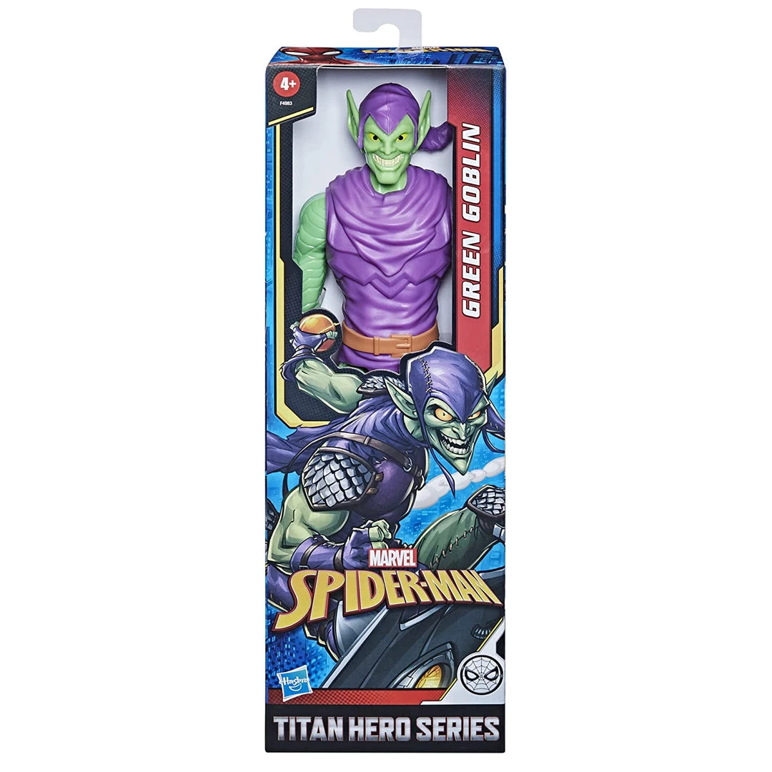 Titan Hero Series Marvel Spider-Man Green Goblin 12 Inch Action Figure. The Green Goblin wreaks high-tech havoc on New York City! Enter the Marvel Universe and swing into action and adventure with Spider-Man! Discover a world of mighty Super Heroes and powerful villains in exciting stories of good versus evil with Spider-Man Titan Hero Series 12-inch-scale action figures. Featuring classic-inspired design and detail as well as multiple points of articulation for poseable fun, boys and girls will love pretending to soar into battle with this 12-inch-scale Green Goblin action figure!