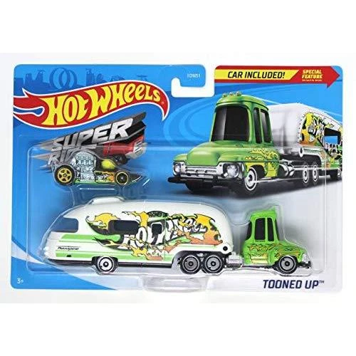 Details: Green Team Hot Wheels Tooned Up Super Rigs vehicle with a detachable trailer and car for 3 and up.