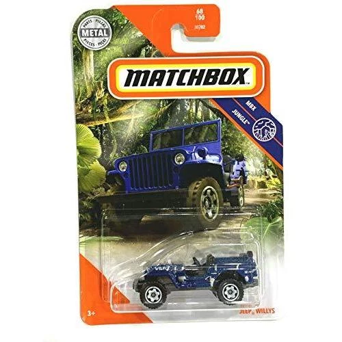 Matchbox Jeep Willys MBX Jungle 68/100. Â This Matchbox Jeep Willys features a blue body paint job, with jungle equipment detailing such as a shovel and open top.