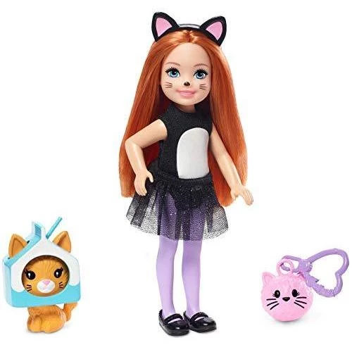 Details: Chelsea and her friends inspire young minds to explore the world. Just like big sister Barbie, they love to try new things, challenge themselves and have fun. Kids can play out so many fun stories with 6-inch Chelsea dolls in themed costume fashions! This Chelsea dress-up doll is super-cute in a cat costume with a sparkly, ruffled skirt. A cat-ear headband and black shoes complete her look, and her kitty friend tags along in an adorable milk carton costume. An included charm keychain makes it easy to clip her to a backpack or clothing -take Chelsea doll On-the-Go to wear and share with friends! Imaginations will love playing out big stories with small dolls. Collect them all for even more playtime inspiration (each sold separately, subject to availability). Colors and decorations may vary.