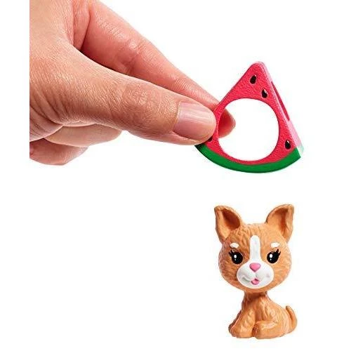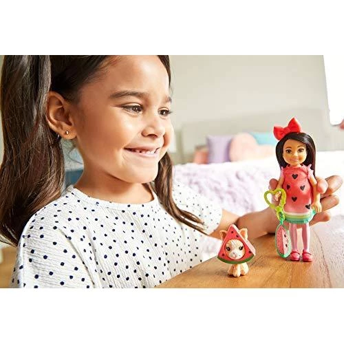 Details: Chelsea and her friends inspire young minds to explore the world. Just like big sister Barbie, they love to try new things, challenge themselves and have fun. Kids can play out so many fun stories with 6-inch Chelsea dolls in themed costume fashions! This Chelsea dress-up doll is super-cute in a watermelon costume with a sweet print and ruffle details. A bow-shaped headband and red shoes put the finishing touches on her look, and her kitty friend tags along in a matching costume. An included charm keychain makes it easy to clip her to a backpack or clothing -take Chelsea doll On-the-Go to wear and share with friends! Imaginations will love playing out big stories with small dolls. Collect them all for even more playtime inspiration (each sold separately, subject to availability). Colors and decorations may vary.