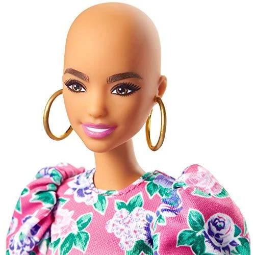 - βBarbie doll has no hair and wears a pink dress with colorful floral pattern and puffy sleeves.