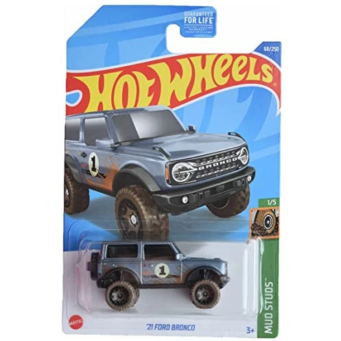 Hot Wheels ’21 Ford Bronco, Mud Studs 1:64 scale vehicle for ages 3 and up. Hot Wheels has been challenging the limits since 1968, passionately creating the coolest and craziest toy cars and tracks for non-stop fun. Hot Wheels evolved from a line of 16 die-cast cars into a global lifestyle brand dedicated to fast action and over-the-top, epic stunts. Today, the line provides variety and freshness with 400 new cars every year! The cars are segmented into 30 different Mini Collections. Each Mini Collection includes themed vehicles ranging from muscle cars, sports cars, race cars, trucks, and trending roadsters. HW vehicles are enduring favorites of collectors and racing fans of all ages. Choose your favorite and collect them all or pick and choose from different collections to create your very own! Each sold separately, subject to availability. Colors and decorations may vary.